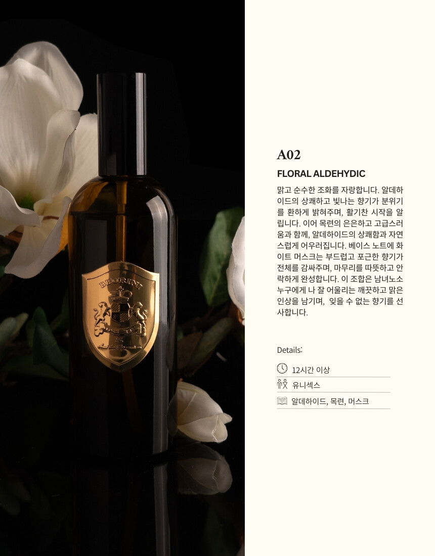 맑은 공기와 같은 알데하이드 탑노트를 시작으로, 목련 꽃 마디가 더해져 청량함과 깨끗함이 연출됩니다. 베이스노트의 머스크는 이들을 부드럽게 감싸며, 고급스러운 캐미시어 향기를 완성시킵니다.