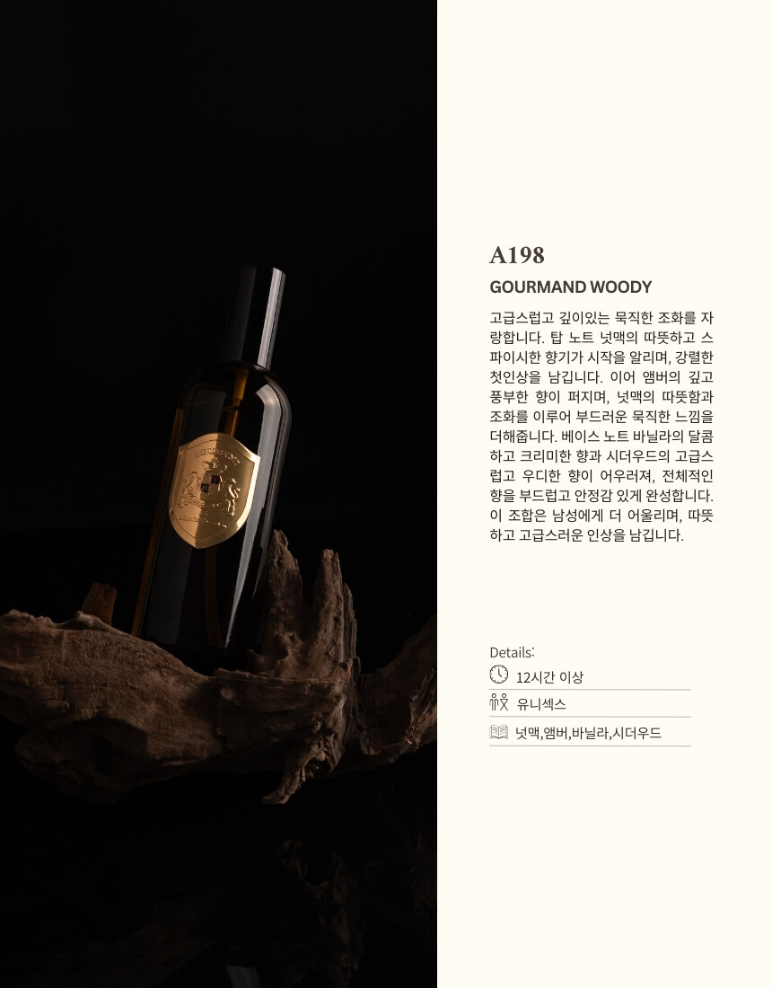 고급스럽고 깊이있는 묵직한 조화를 자랑합니다. 탑 노트 넛맥의 따뜻하고 스파이시한 향기가 시작을 알리며, 강렬한 첫인상을 남깁니다. 이어 앰버의 깊고 풍부한 향이 퍼지며, 넛맥의 따뜻함과 조화를 이루어 부드러운 묵직한 느낌을 더해줍니다. 베이스 노트 바닐라의 달콤하고 크리미한 향과 시더우드의 고급스럽고 우디한 향이 어우러져, 전체적인 향을 부드럽고 안정감 있게 완성합니다. 이 조합은 남성에게 더 어울리며, 따뜻하고 고급스러운 인상을 남깁니다.