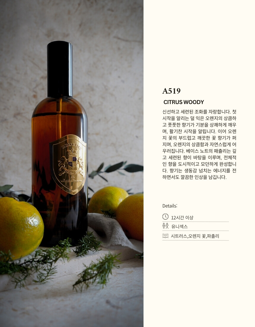 시트러스의 화려함과 세련된 허브의 향기가 어우러져 매력적인 조화를 표현합니다.상쾌하면서도 품격 있는 느낌을 주며, 자신감과 매력을 강조하여 많은 사람들에게 인상적인 향기입니다.