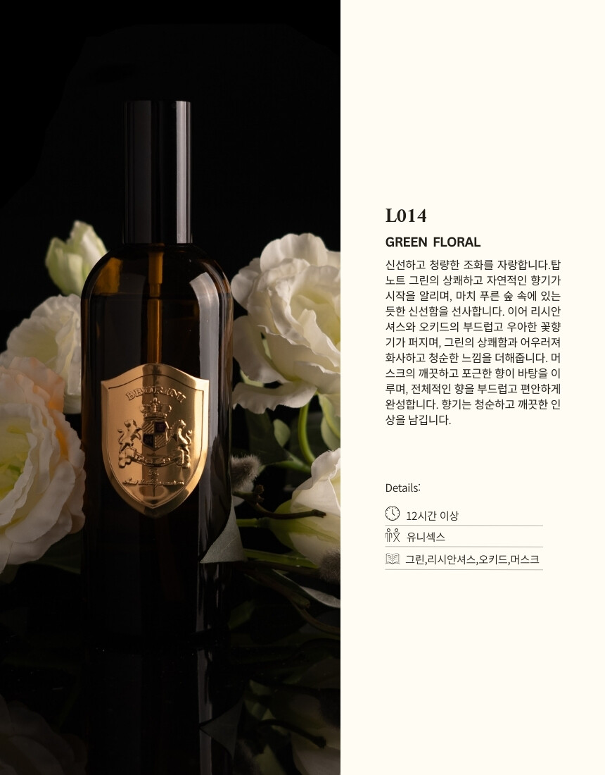 신선하고 청량한 조화를 자랑합니다.탑 노트 그린의 상쾌하고 자연적인 향기가 시작을 알리며, 마치 푸른 숲 속에 있는 듯한 신선함을 선사합니다. 이어 리시안셔스와 오키드의 부드럽고 우아한 꽃향기가 퍼지며, 그린의 상쾌함과 어우러져 화사하고 청순한 느낌을 더해줍니다. 머스크의 깨끗하고 포근한 향이 바탕을 이루며, 전체적인 향을 부드럽고 편안하게 완성합니다. 향기는 청순하고 깨끗한 인상을 남깁니다.